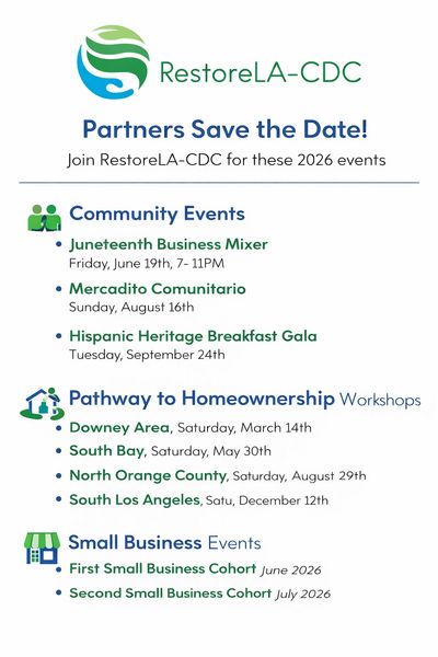 RestoreLA-CDC is excited to share our 2026 calendar of community-centered events designed to support families, aspiring homeowners, and small business owners across Los Angeles County. Join us for impactful Community Events, including our Juneteenth Business Mixer, Mercadito Comunitario, and Hispanic Heritage Breakfast Gala. We will also host a series of Pathway to Homeownership Workshops throughout the year in Downey, South Bay, North Orange County, and South Los Angeles, providing education and resources to help residents move toward sustainable homeownership. In addition, our Small Business Cohorts launching in June and July 2026 will offer hands-on support for entrepreneurs looking to start, grow, or stabilize their businesses. More details and registration information will be shared soon—partners and community members are encouraged to mark their calendars and stay connected.