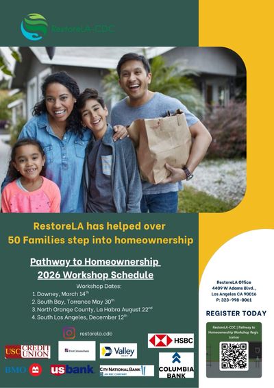 RestoreLA-CDC offers a FREE Pathway to Homeownership Workshop designed to help families achieve the American Dream of homeownership. We believe that supporting families on their journey toward homeownership—and building long-term wealth through home equity—is a powerful way to help bridge the wealth gap in our communities.